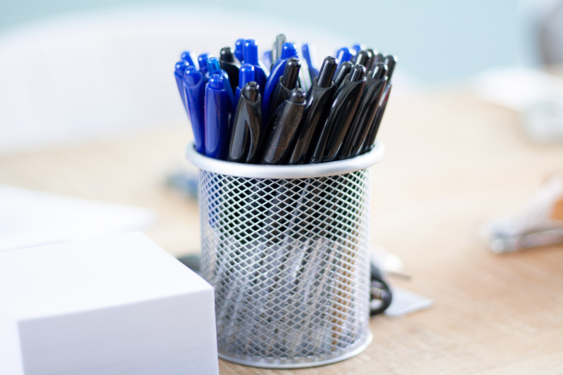 Een bakje vol pennen en een memoblokje staan klaar op tafel.Met als doel natuurlijk om direct kleine ingevingen op te ...